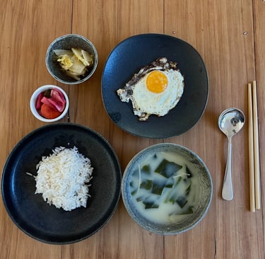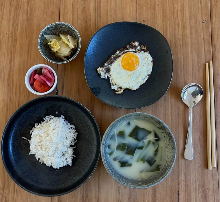 I had the seaweed soup with some rice, an egg, white kimchi and pickled beetroot and radish (also very good for you)